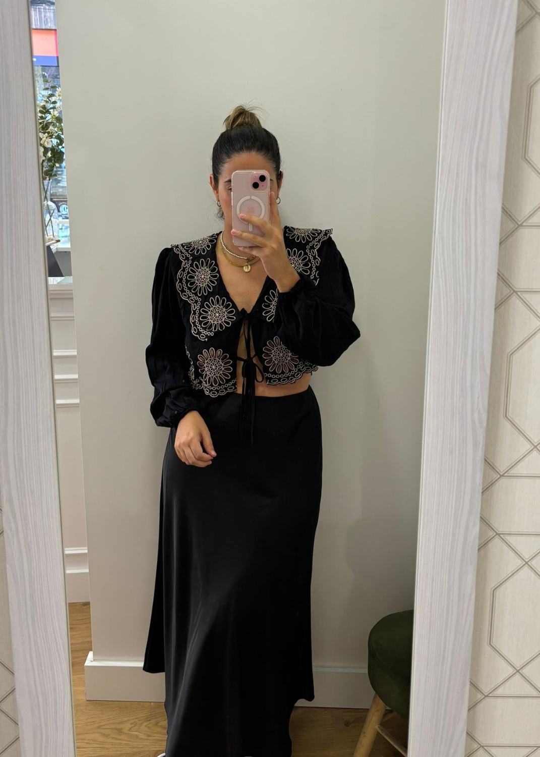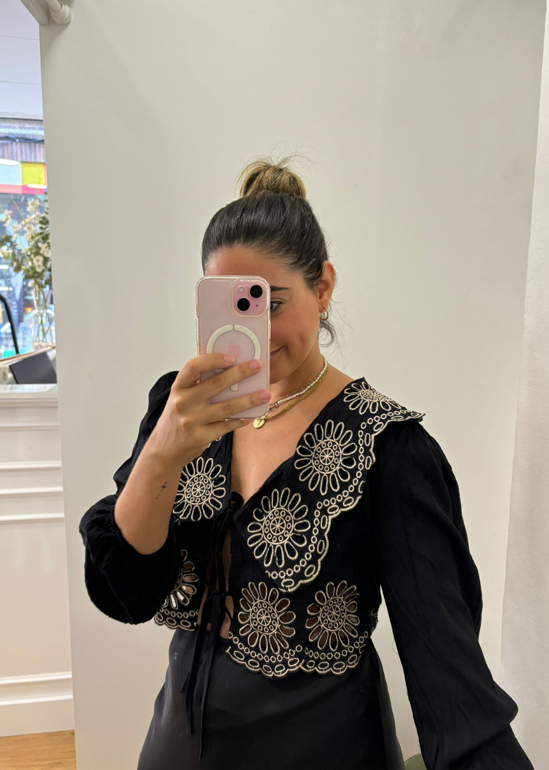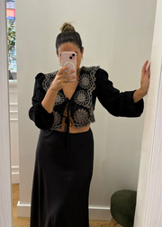 Blusa color negra. Detalle de bordado - calado en color dorado. Una prenda orginal.