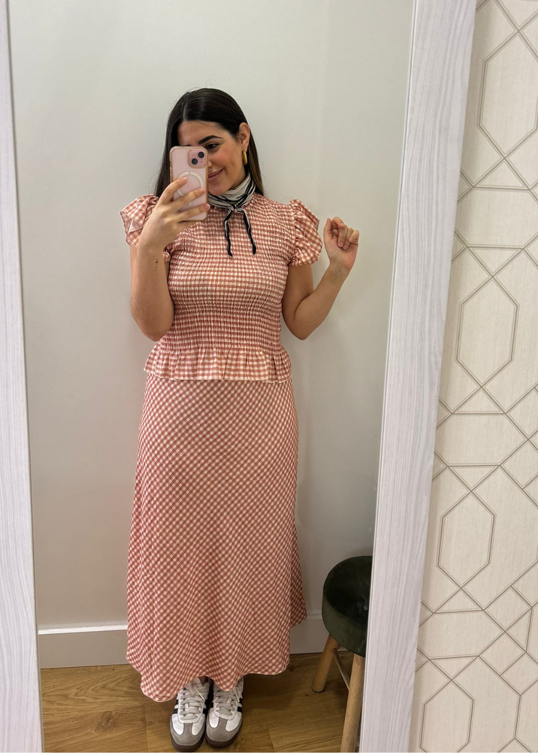 Blusa Vichy color rosa apagado. Elástico nido de abeja para adaptarse a diferentes contornos. Pequeño volante en su acabado y volantes en sus hombros.