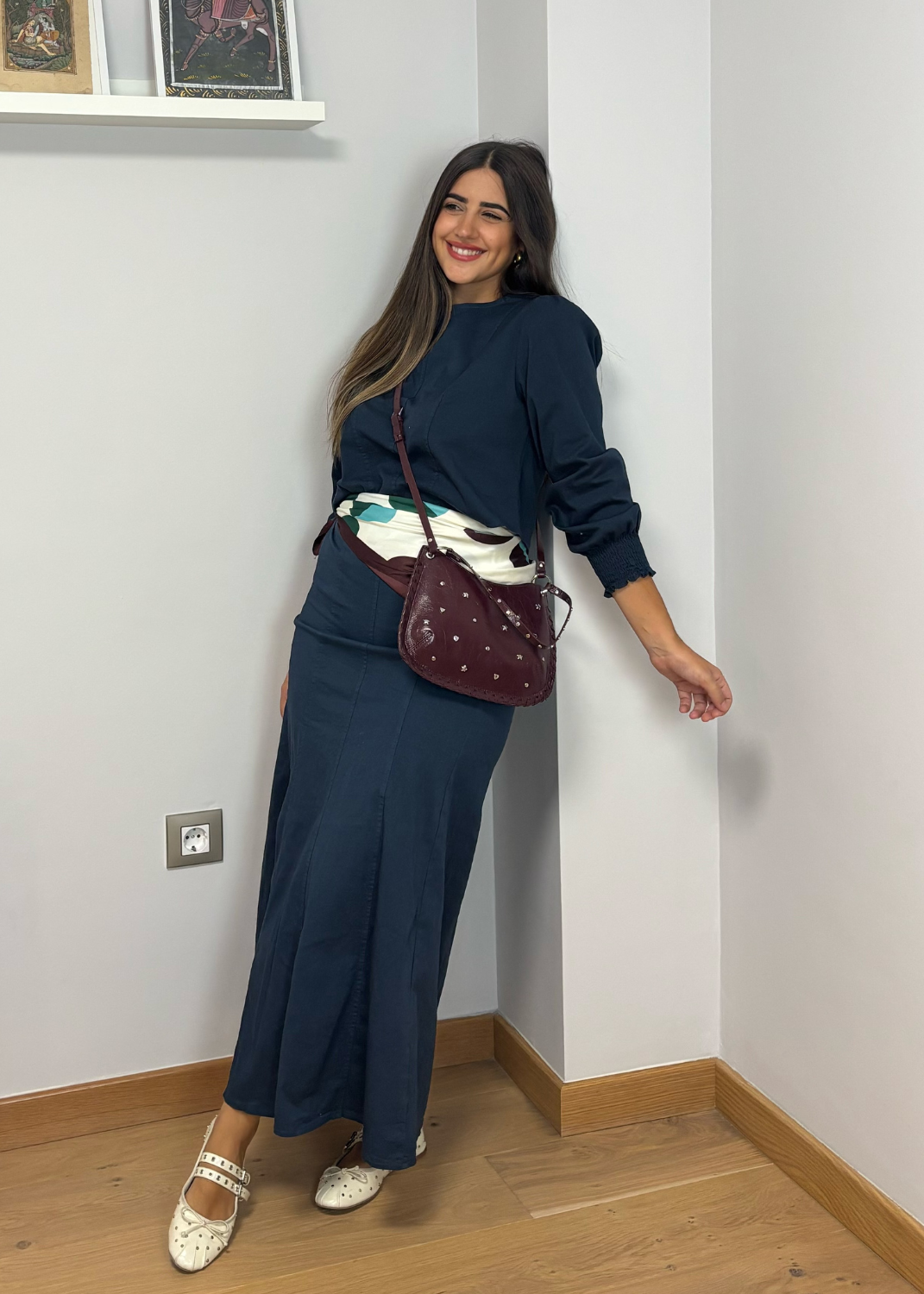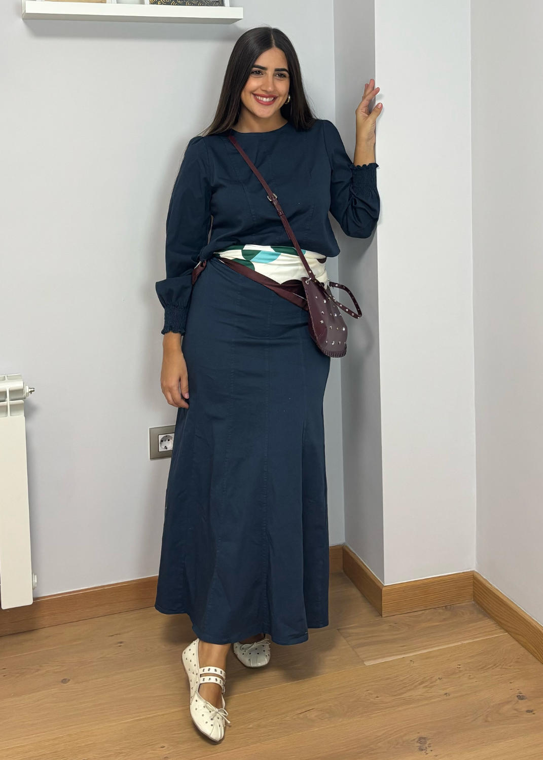 Conjunto dos piezas. Falda + Blusa. Elástico. Color vaquero.