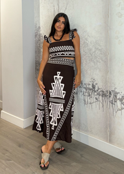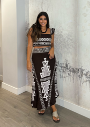 Conjunto dos piezas etnico. Top con volantes en su tirantes . Falda midi larga con goma en cintura. Color marrón Mocca.