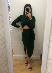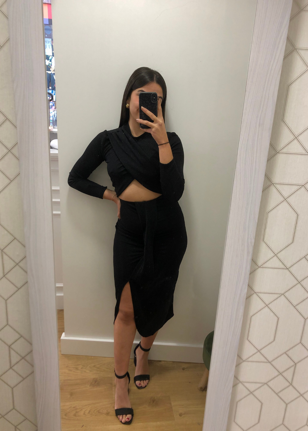 Conjunto dos piezas top + falda midi con abertura. Tejido lurex con fondo negro y destellos de brillo.