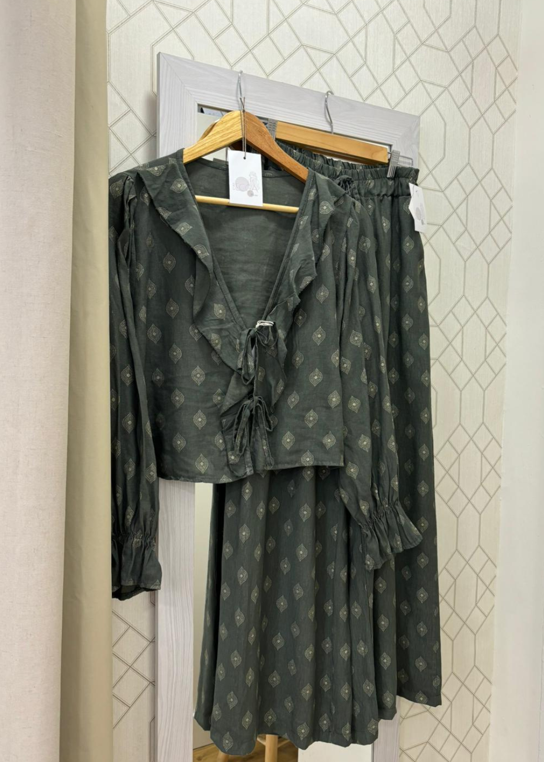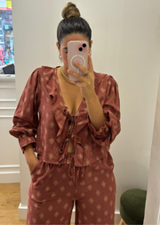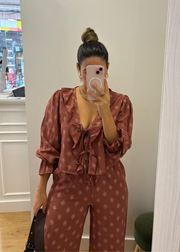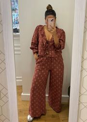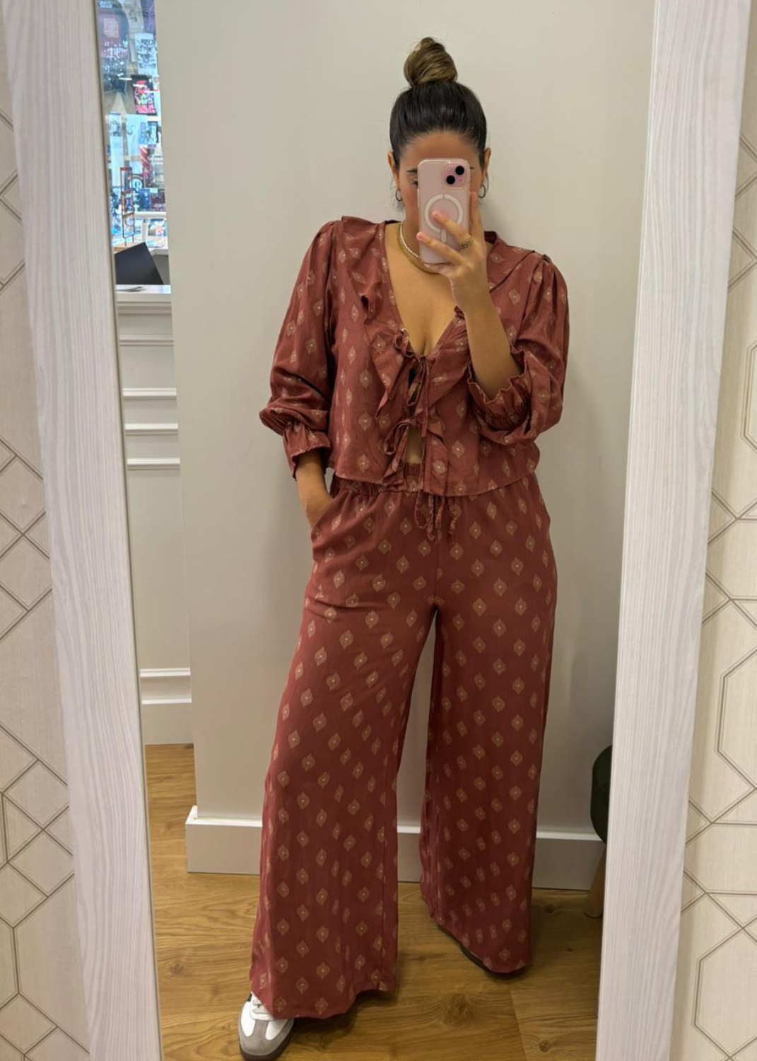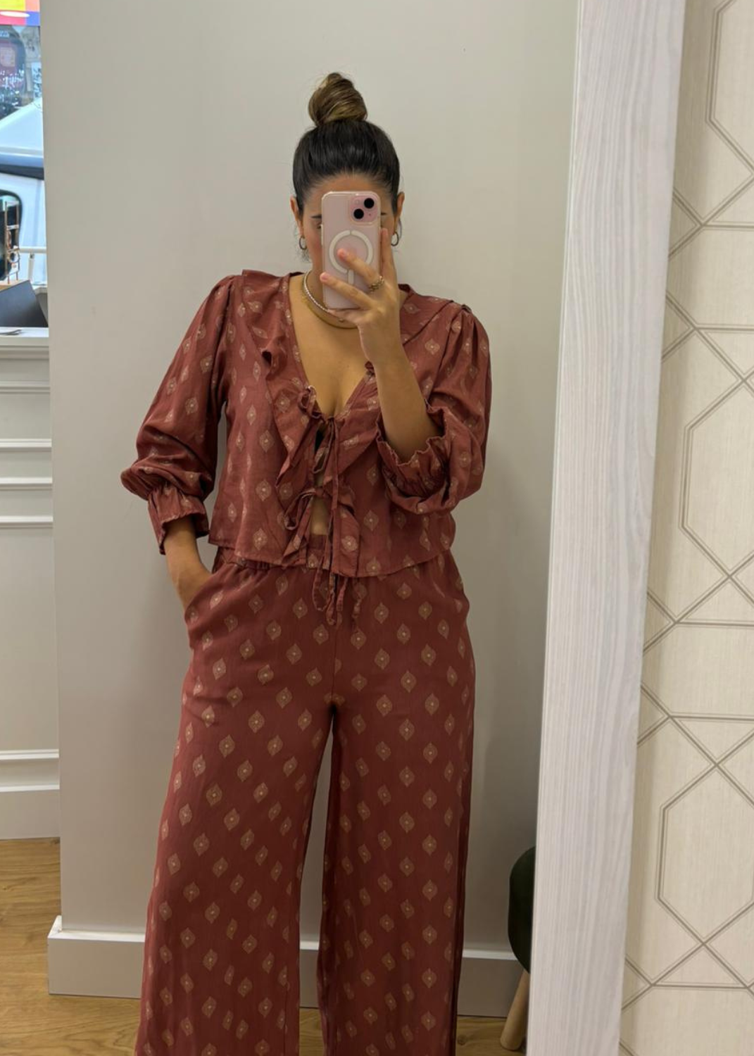 Total look completo de top + pantalón. La blusa es de doble lazada, con magas abullonadas y cuello con volante. El pantalón tiene goma en la cintura, tiro alto y corte recto amplio.