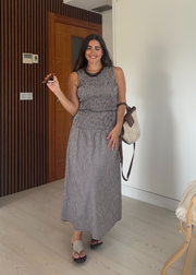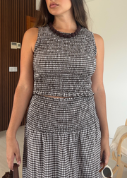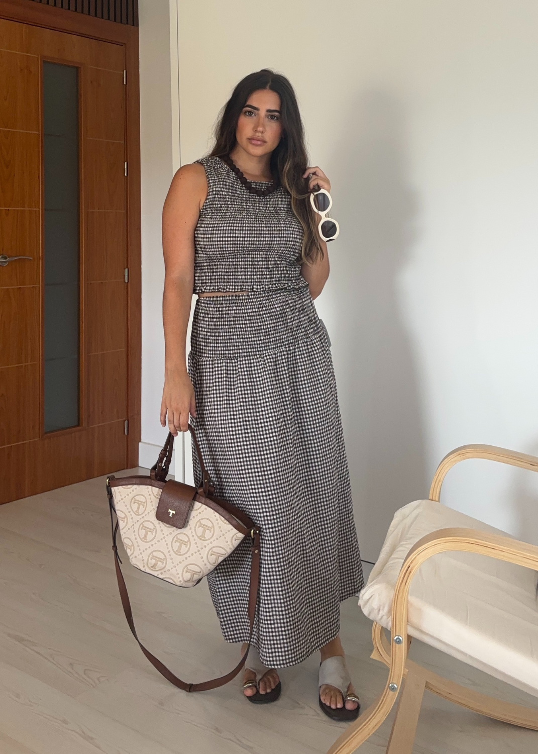Conjunto dos piezas. TOP + FALDA. El top tiene un fruncido nido de abeja que permite adaptarse al contorno-pecho. La falda tiene un fruncido nido de abeja en la zona de cintura y cadera, perfecto también para poder adaptarse. La caída es amplia.