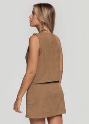 Falda tiro alto. Cierre con cremallera en la espalda. Estampado de rayas. Diseño dos piezas junto con su chaleco para hacer look completo. Color camel unos de los colores estrellas en septiembre. Huele a otoño.