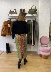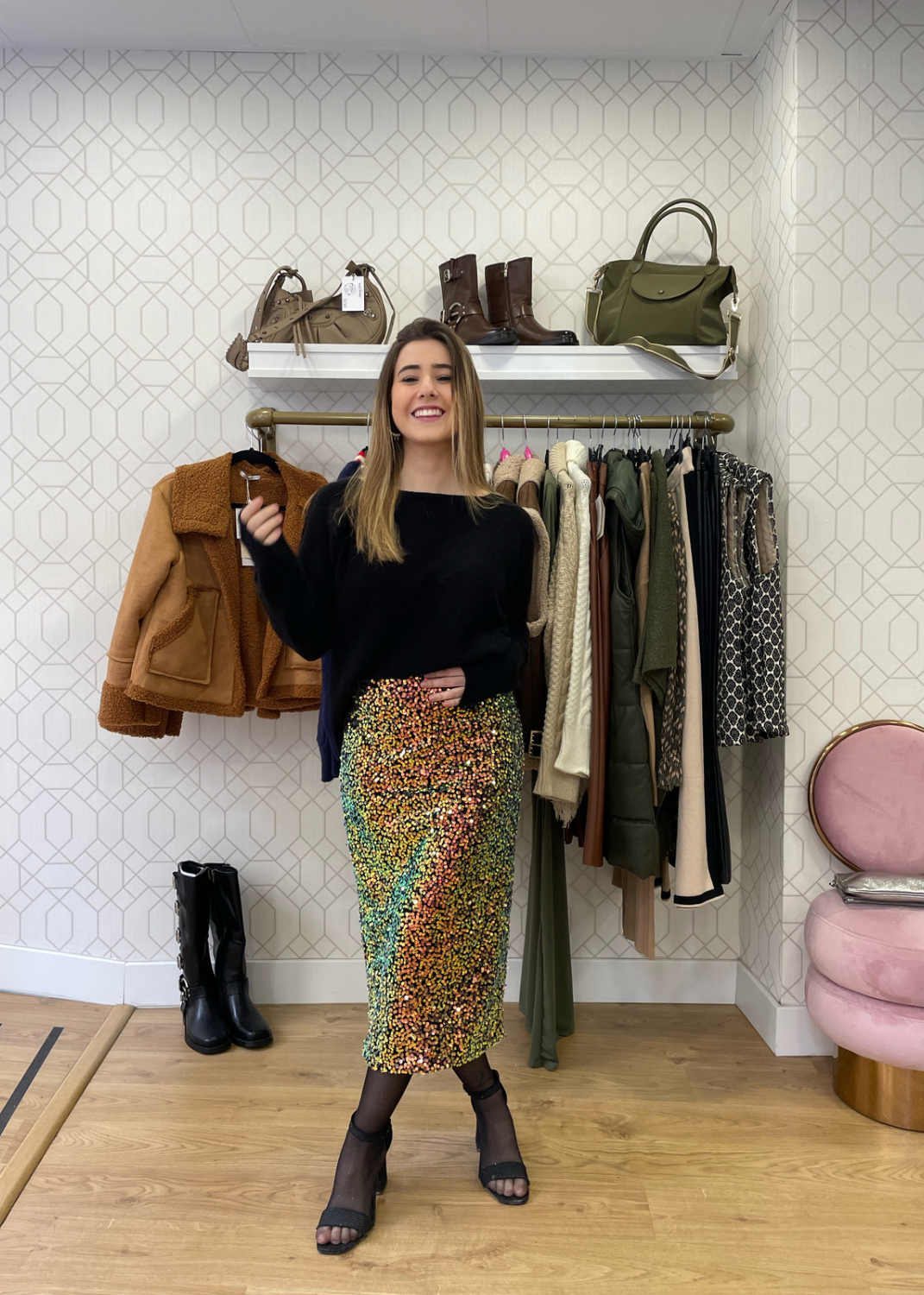 Falda midi de lentejuelas con abertura en la parte de atrás y forro interior. Goma en la cintura.