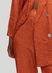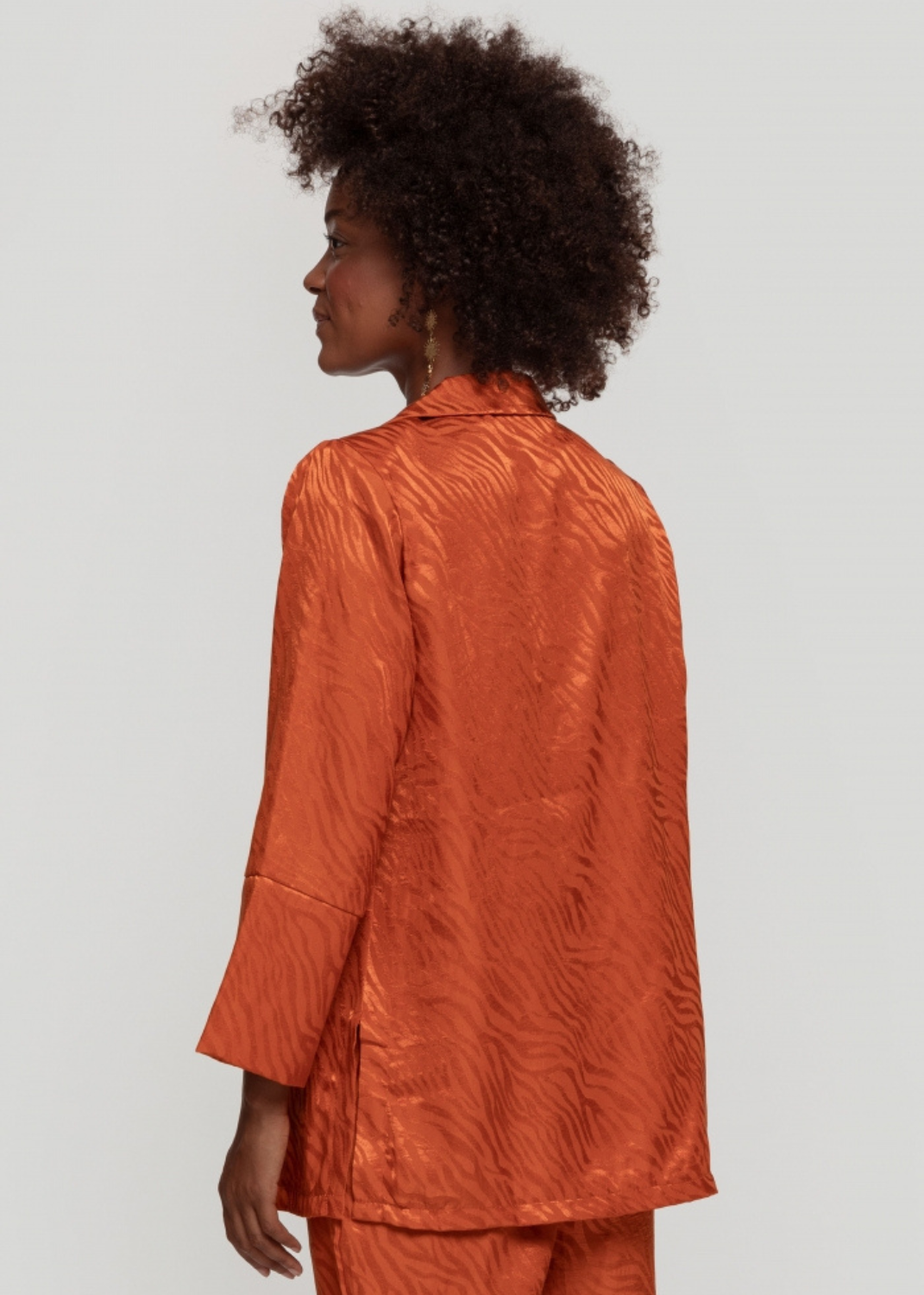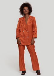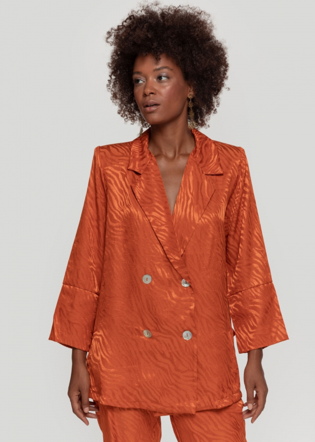Una chaqueta con cuello de solapa que se complementa con unas sutiles hombreras que le aportan estructura. Y, un pantalón de pierna pata de elefante con el que te sentirás cómoda en todo momento.