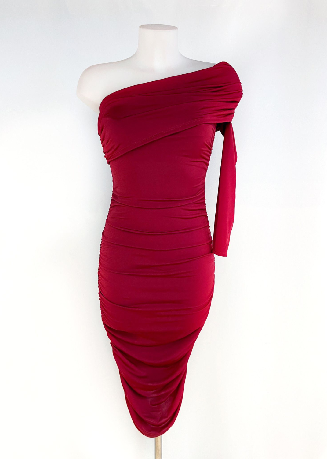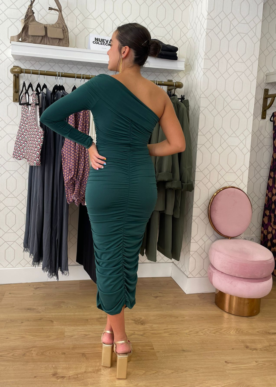 Vestido diseño midi. Corte asimétrico, manga si, manga no. Un toque sexy y elegante a su vez.