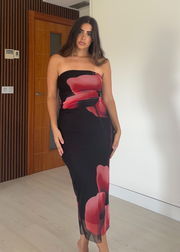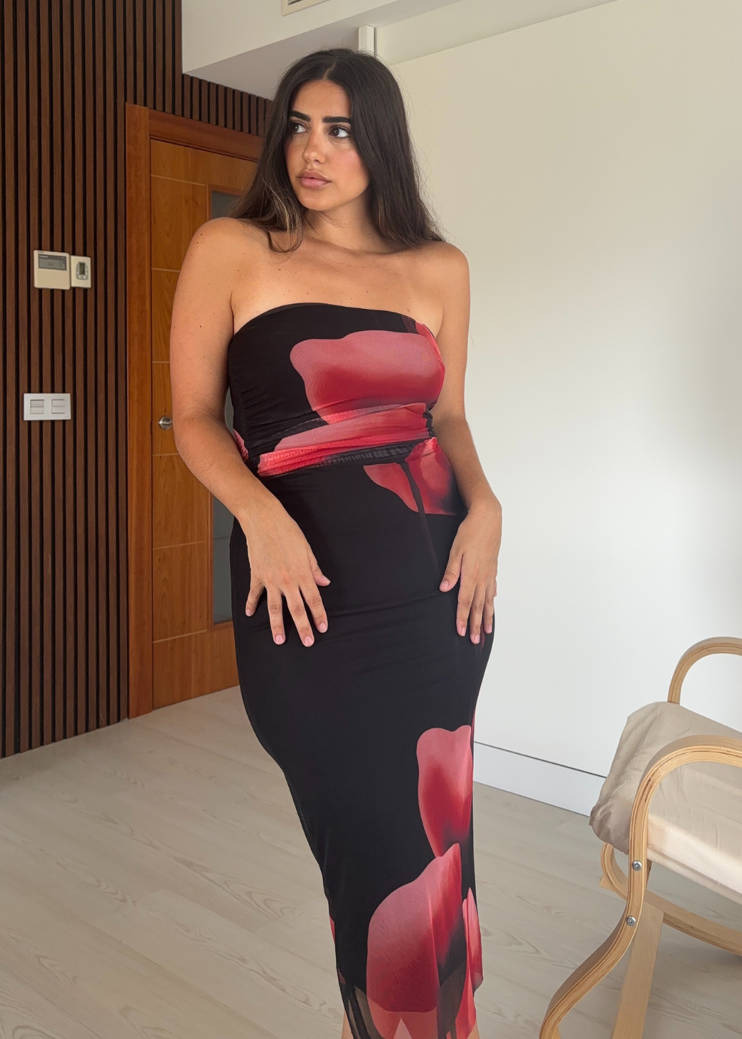 Vestido palabra de honor. Tejido Tull. Forrado en color negro. Fruncido en la cintura. Estampado de flor amapola.