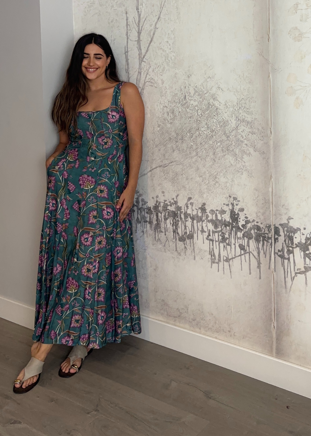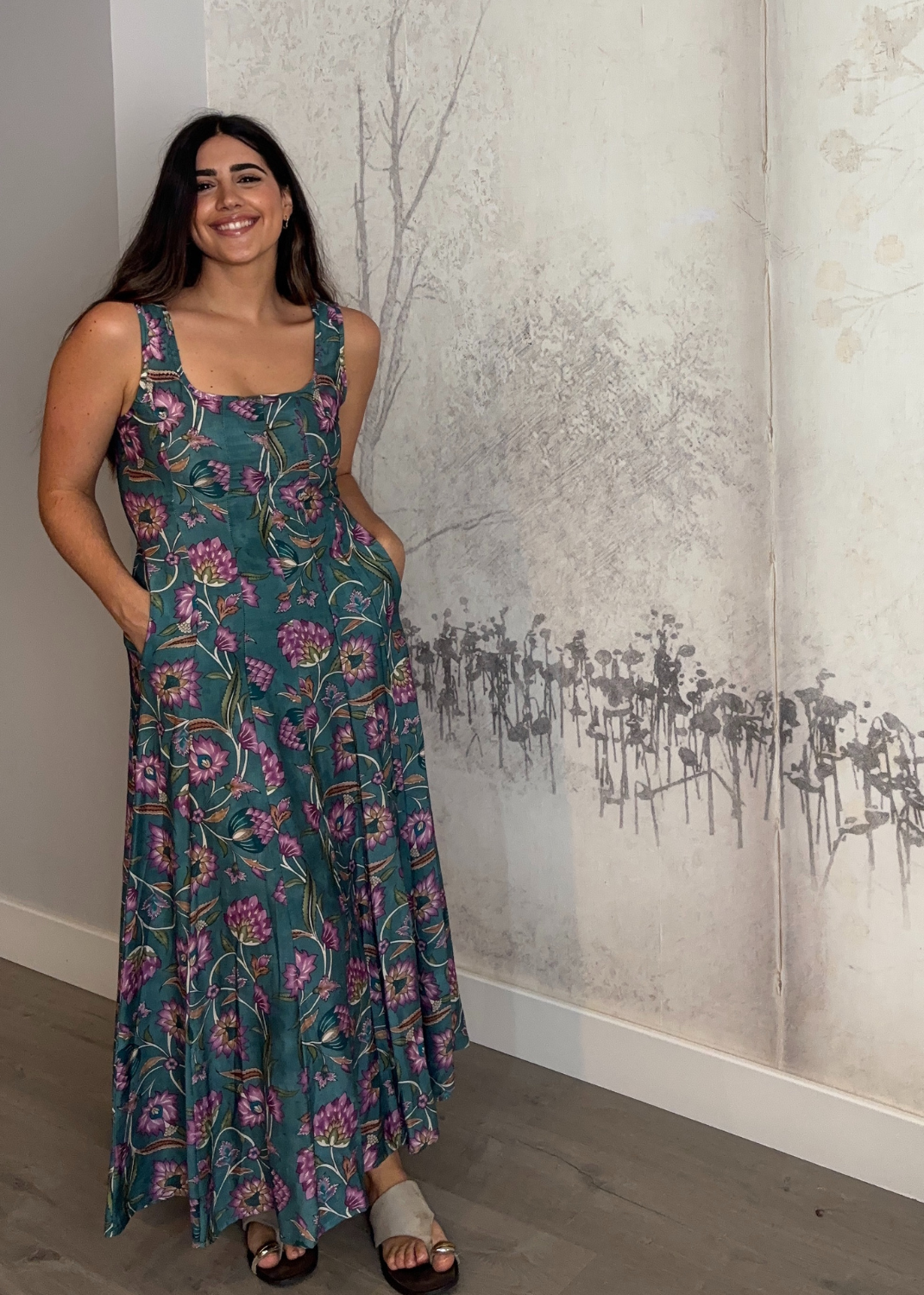 Vestido midi verdeagua con estampado floral, en lino fluido, con escote a la caja, estructura vertical que estiliza, nido de abeja en la espalda, bolsillos laterales y falda ancha. Talla única