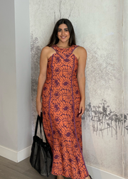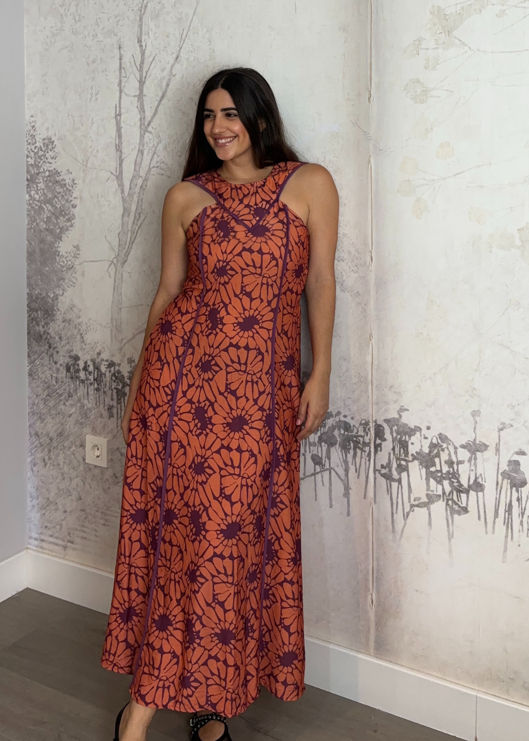 Este vestido midi estampado floral destaca por su elegante escote halter, que se realza con unos vibrantes ribetes en color rojo/granate que marcan la original forma triangular de la parte superior del vestido. Para acentuar aún más la figura, el vestido incorpora dos líneas verticales con el mismo ribete, que recorren la prenda de arriba abajo, creando un efecto visual que afina y estiliza.