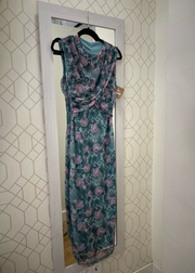 Vestido de tul con estampado floral. Forrado. Corte midi-largo. Drapeado cruzado en la zona del pecho. Abertura en la parte trasera.