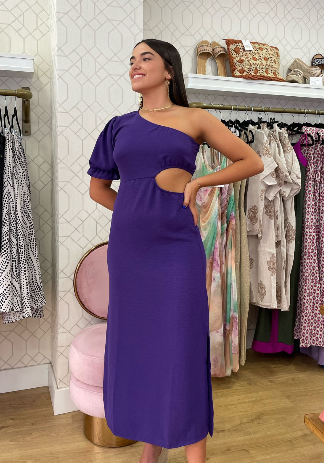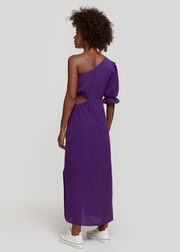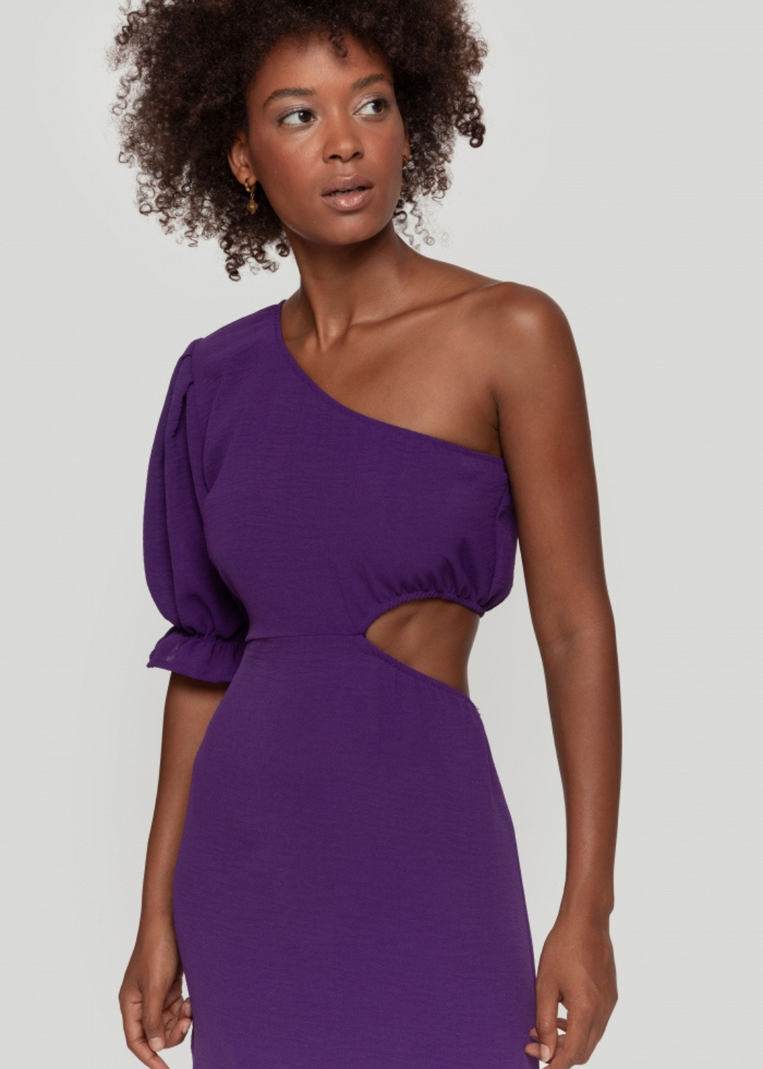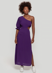 Vestido diseño largo-midi. Corte asimétrico. Manga si y manga no. Abertura cut out en su lateral. Color morado. Prenda forrada. Tejido ligero.